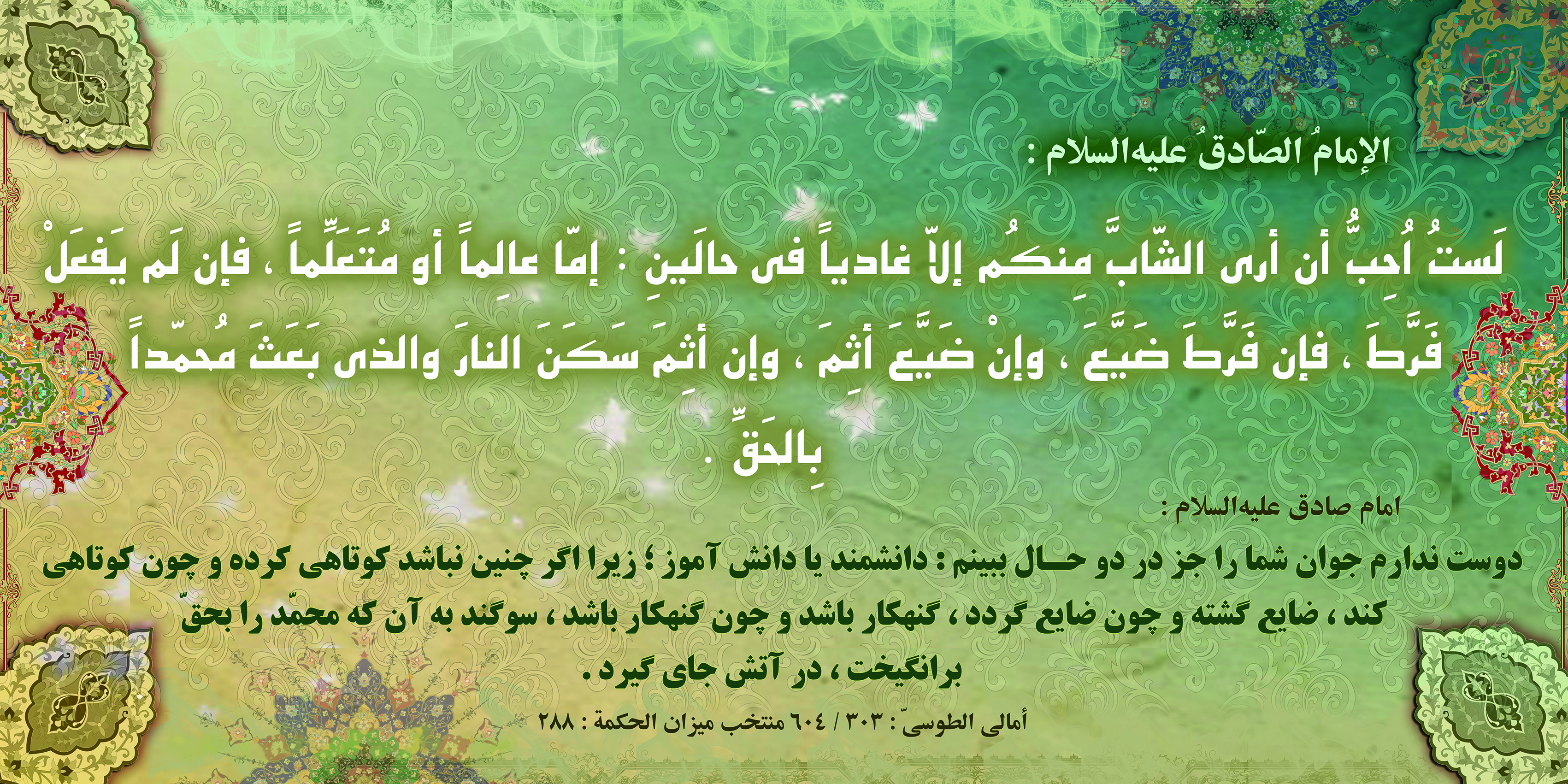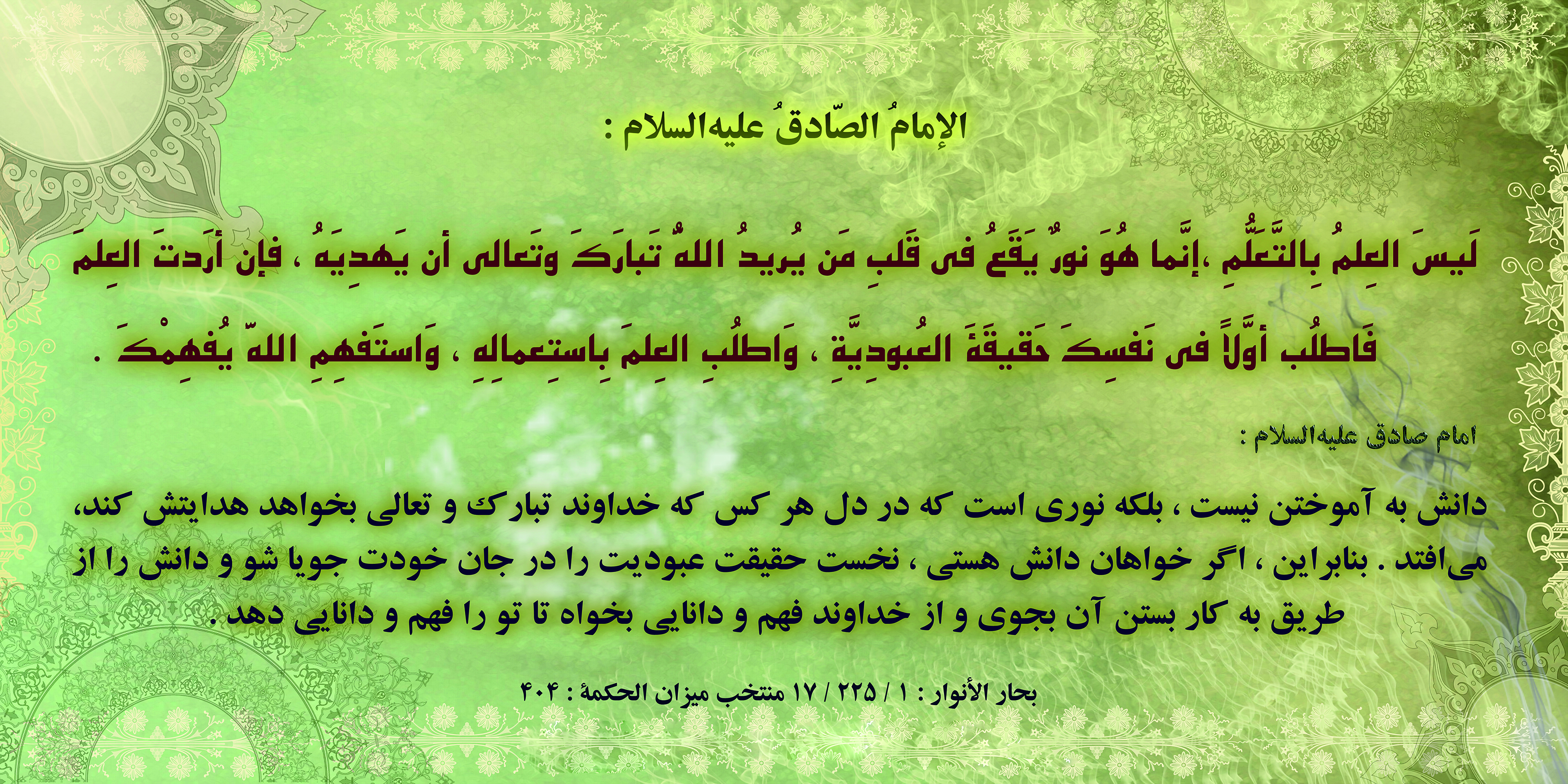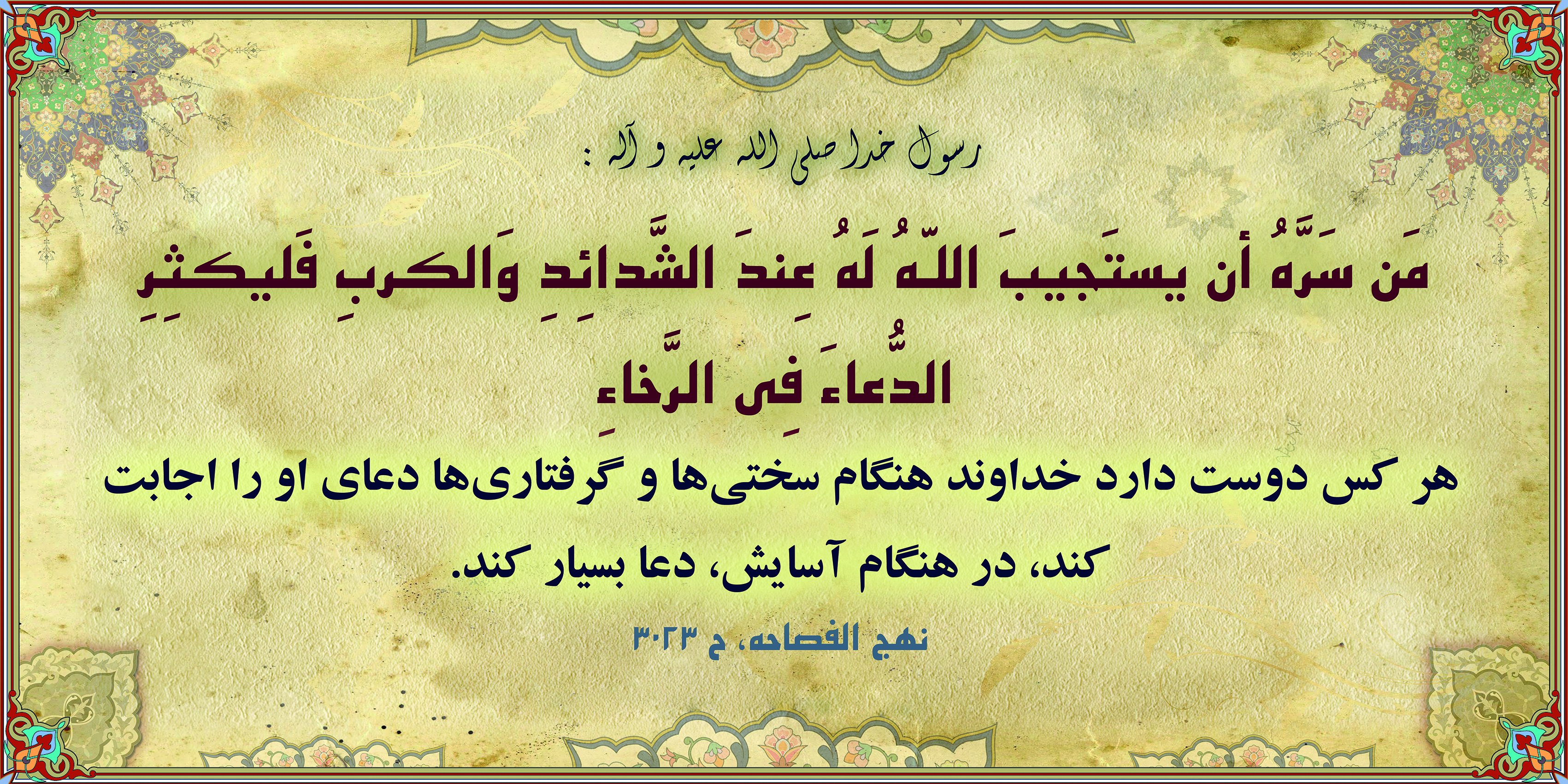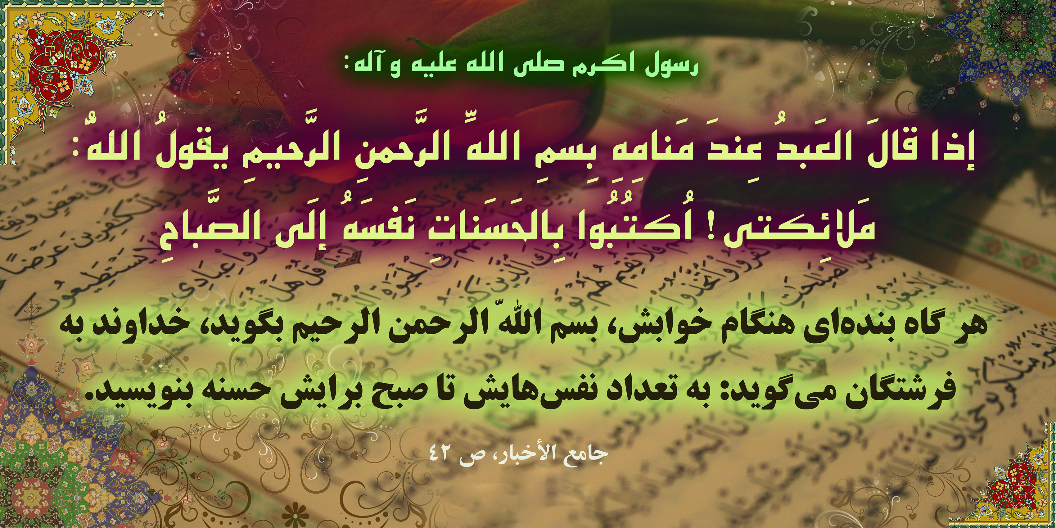 بِسْمِ اَللّٰهِ اَلرَّحْمٰنِ اَلرَّحِیمِ * فَلَمّٰا أَسْلَمٰا وَ تَلَّهُ لِلْجَبِینِ * وَ نٰادَیْنٰاهُ أَنْ یٰا إِبْرٰاهِیمُ * قَدْ صَدَّقْتَ اَلرُّؤْیٰا إِنّٰا کَذٰلِکَ نَجْزِی اَلْمُحْسِنِینَ * إِنَّ هٰذٰا لَهُوَ اَلْبَلاٰءُ اَلْمُبِینُ * وَ فَدَیْنٰاهُ بِذِبْحٍ عَظِیمٍ * صدق الله العلی العظیم ﴿الصافات،103 تا 107﴾